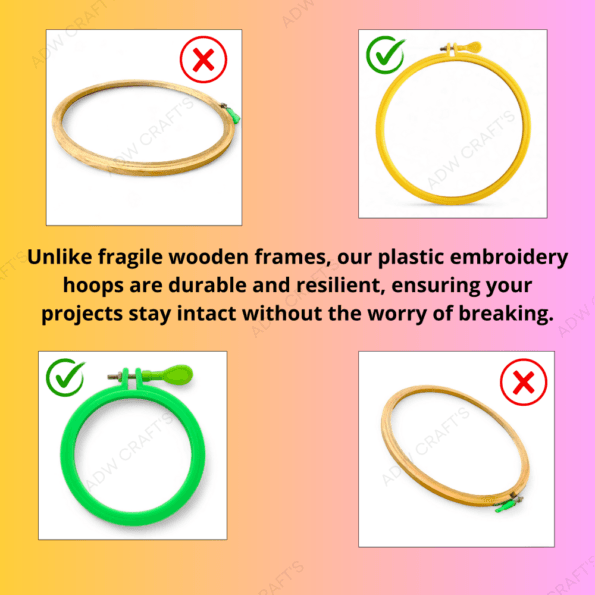 Made from sturdy, high-quality plastic, these embroidery frames are built to last. Unlike wooden hoops that may warp or splinter over time, these plastic frames maintain their shape, providing consistent tension for your fabric. The smooth surface of the hoops prevents snagging, ensuring that your delicate threads remain intact and your designs are flawless.